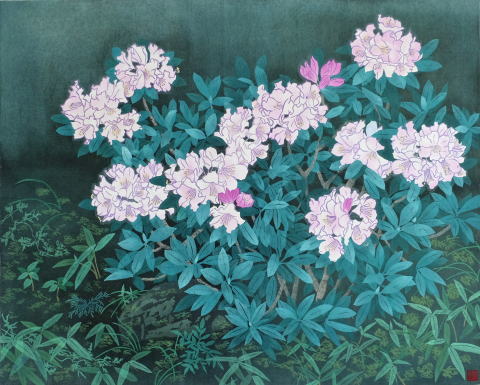 シャクナゲが庭で明るく咲いていたので写生した。シャクナゲの雰囲気いかす場所を探して歩き、シャクナゲで有名な福成寺に行き、片隅にひっそりと咲いているのを見つけ、バックにした。