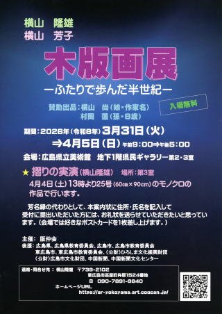 個展は「横山隆雄、横山芳子 木版画展 副題としてーふたりで歩んだ半世紀ー」と銘打って来年3月31日〜4月5日、広島県立美術館地下1階の県民ギャラリー第2・3室を借りて開催することにしました。この展覧会には娘・孫も賛助出品します。