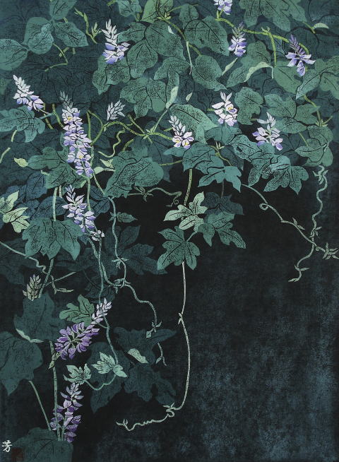 葛の美しい紅紫色の花房、葉、蔓の流れ、風情がある葛の蔓を花瓶に入れ、天井近くからつるし描きこんでいった。
