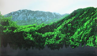 この景色に魅せられて何度も4時間かけて通った。空の雲間から薄く見える青さを少しのぞかせて山の高さを表現した。この作品は、こだわりの緑を追求した作品で日展に2度目の入選で嬉しく、緑にこだわった甲斐があったとつくづく思った。こだわりの緑の集大成の積りで取り組んだ。